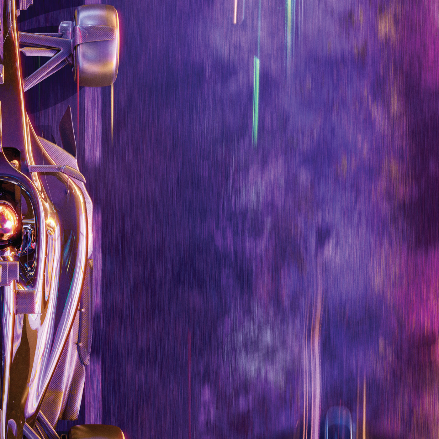 The poster’s deep purples and electric reflections echo the glow of the city’s skyline and the rhythm of the night race, while the embossed detailing adds a tangible layer of depth that captures the movement of light across the track.